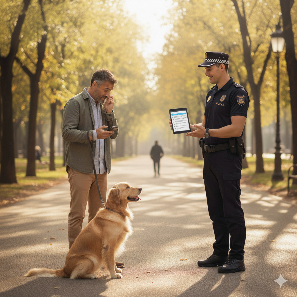 Imagina la escena: estás en tu parque de siempre, tu perro juega felizmente y un agente de la policía local se acerca de forma muy educada. «Buenos días, ¿me permite la documentación del animal, por favor?».